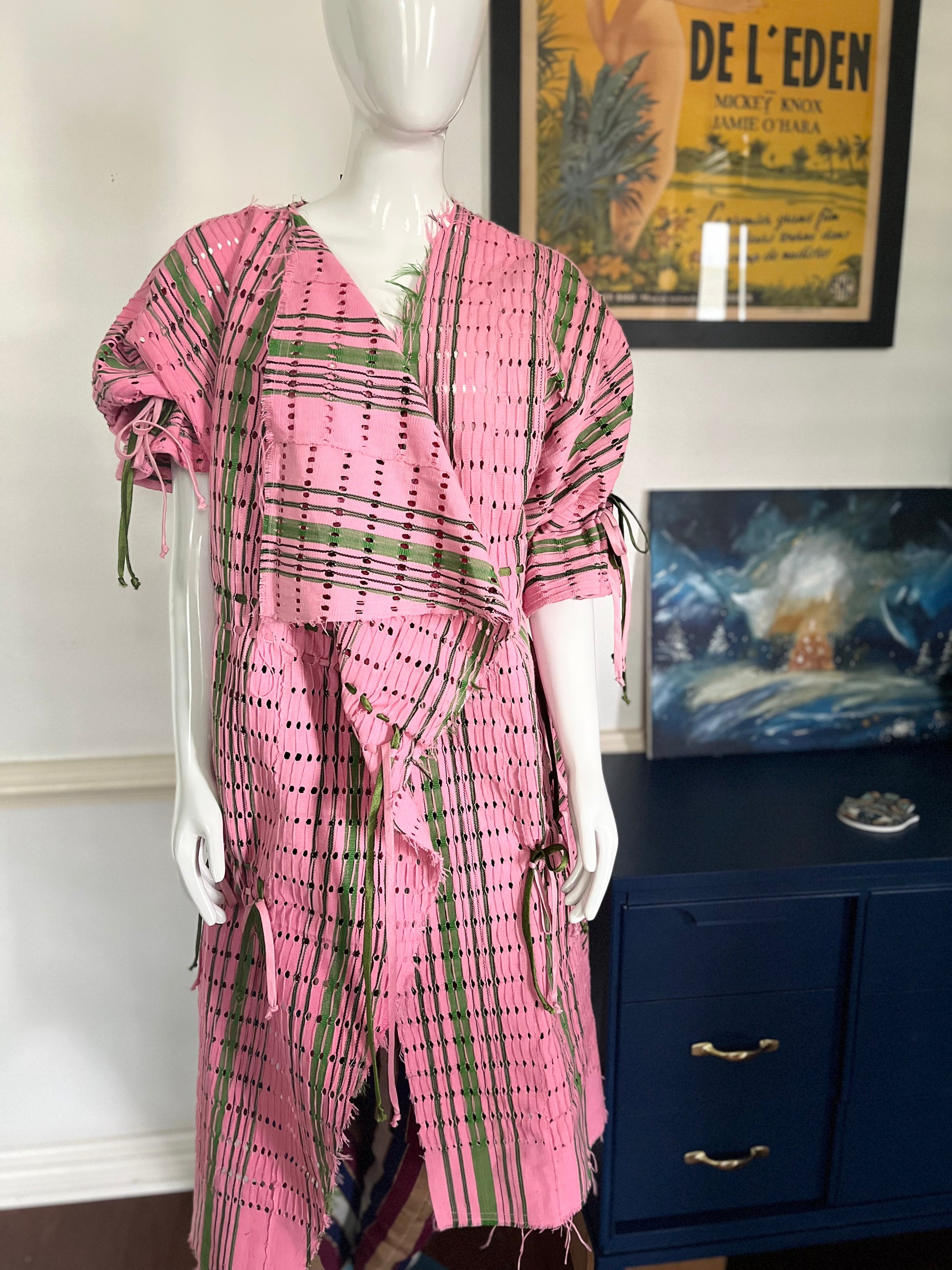 Elevate your wardrobe with ITUEN BASI's Moronkeji Pink Coat Dress. Made from indigenous Asooke fabric and local cotton, this Lagos-based label's versatile piece is perfect for year-round wear. Light and airy, layer it for cooler weather or pair it with jeans and a white shirt for a stylish everyday outfit. Available in limited quantities, exclusively from our Houston warehouse
